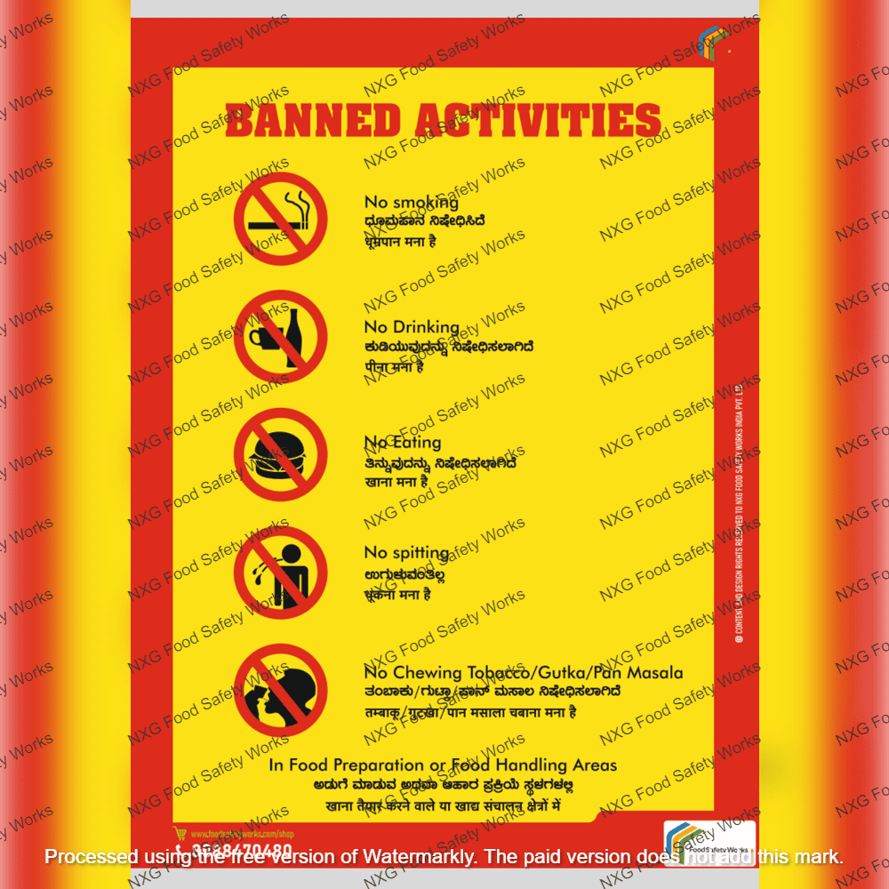 Ensure strict food safety compliance with our Banned Activity Poster, designed for food processing, handling, and preparation areas. This durable, multilingual signage clearly communicates prohibited activities such as smoking, eating, drinking, spitting, and chewing tobacco, helping maintain hygiene standards and audit readiness.